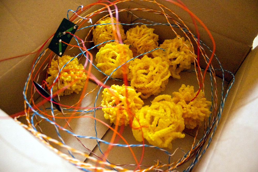 The Sol sculpture which encloses the electronics is made with special custom software through progressions of finely tuned mathematical parameters for the autonomous agents, whose routes are in turn transformed into volumetric space for sculpture making.